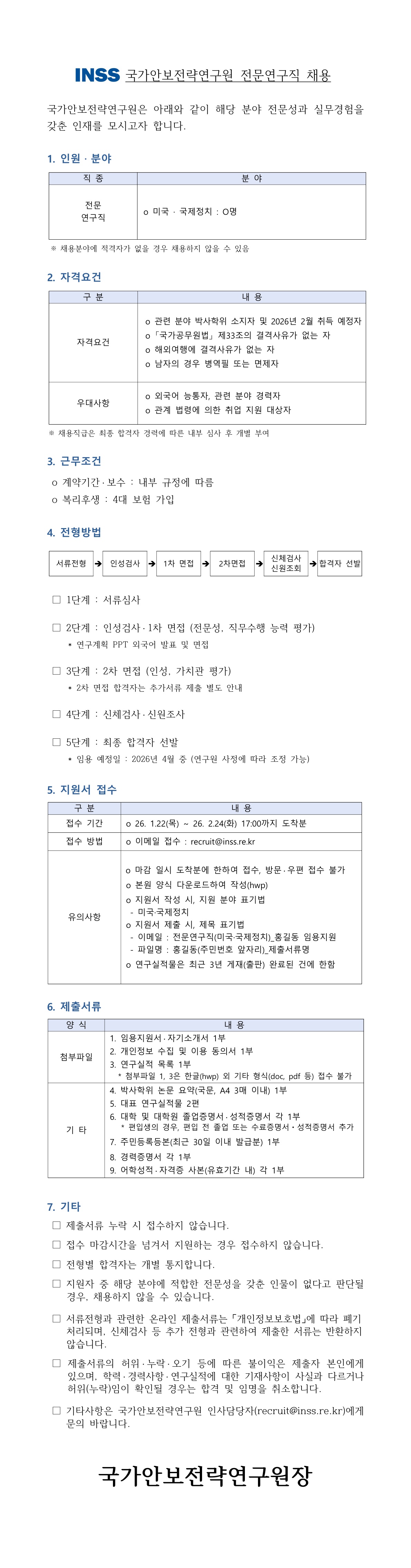 [채용공고] 국가안보전략연구원 전문연구직 채용